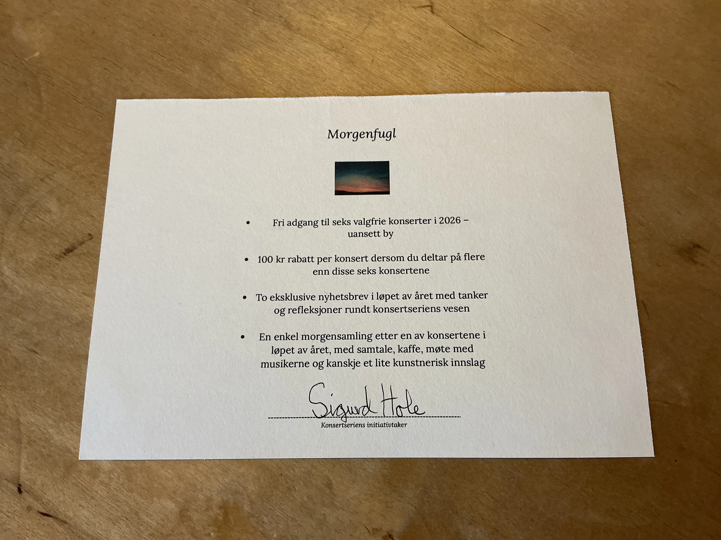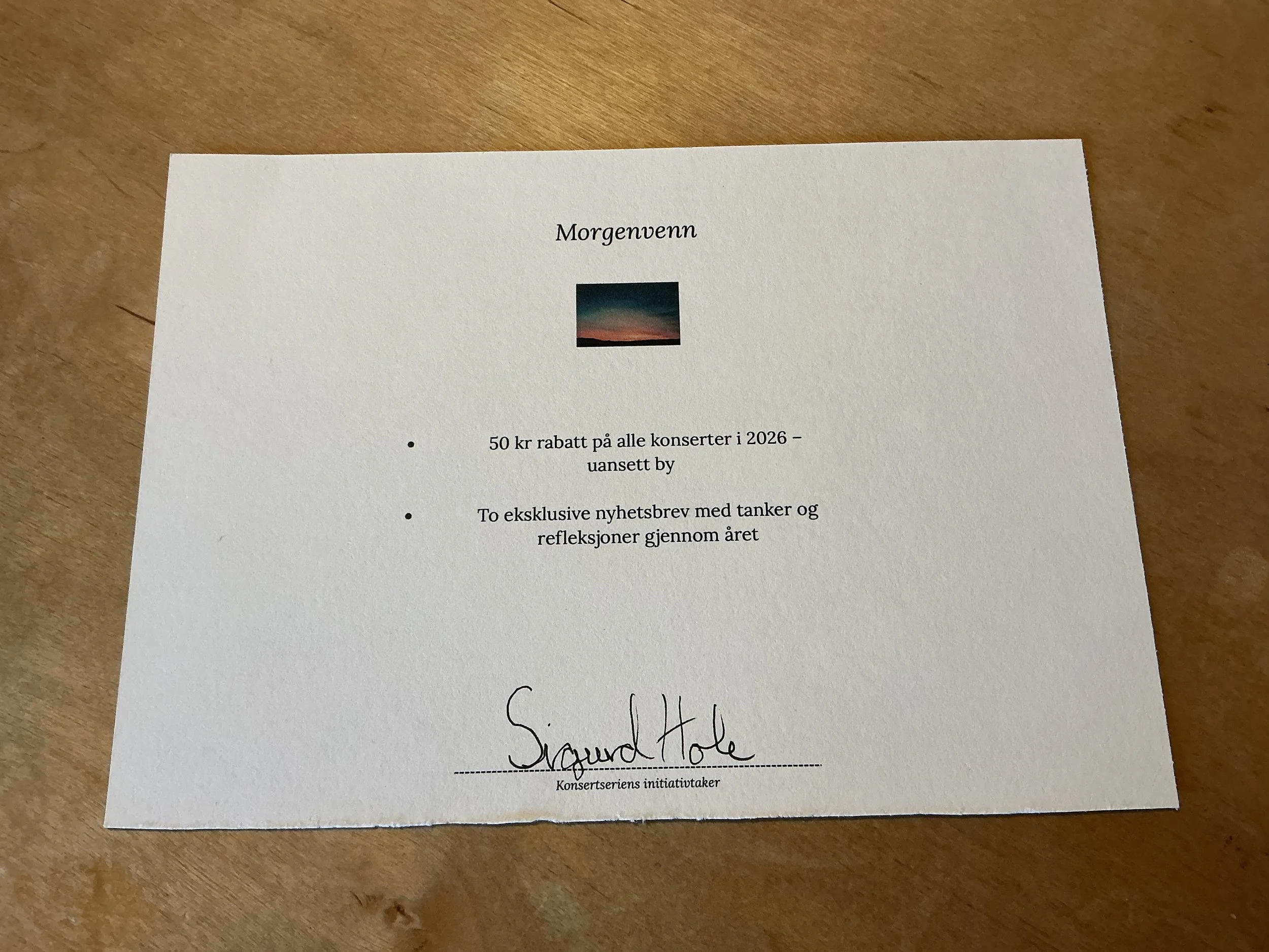 Det arrangeres 12 morgenkonserter i 2026, seks i Hamar og seks i Oslo. Ofte faller konsertene i hver by på samme dag - men ikke alltid. Nå tilbyr vi to former for medlemskap, slik at du kan bli en støttespiller som er med på å bære konsertserien gjennom året.